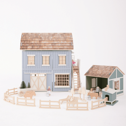 Inspired by Scandinavian architecture, the House of Stockholm features many unique elements to discover, including sliding barn doors, sliding windows, movable shutters, easily removable roof, exterior staircase, and sliding interior door. This elegant dollhouse will be a favorite among children who love animals.